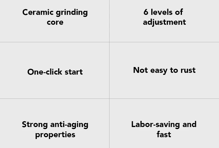 Customize your seasoning with six precise coarseness levels. Switch between fine, medium, or coarse grinding to match any recipe or preference.